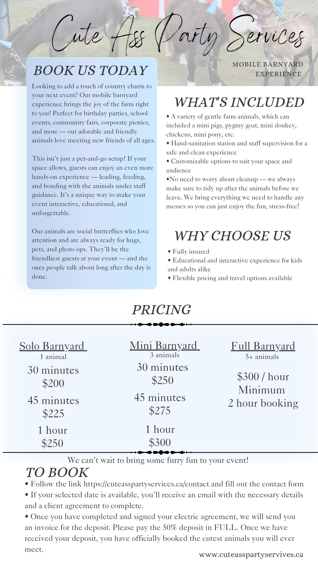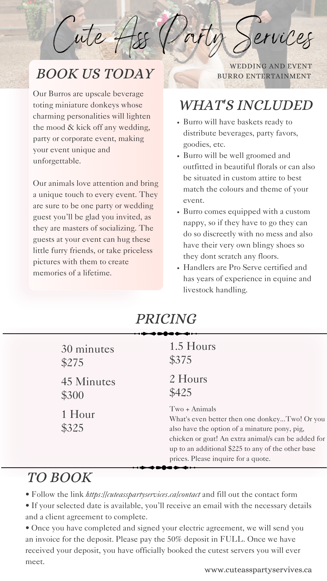 We would love to be part of your special event. Since we do travel, pricing does vary depending on the location of your event so please contact us for further pricing. We do require 50% non-refundable deposit due upon reservation. Refunds are only available if the Burro has to cancel due to weather, road conditions or donkey illness or injury. All prices are subject to a transportation fee (0.65/km) and GST.