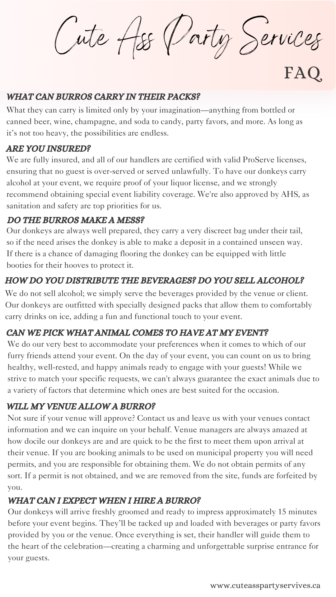 Consider adding a burro to your Engagement Party, Rehearsal Dinner, or as a delightful after-dinner surprise to entertain guests who aren’t quite ready to hit the dance floor. Or, for a fun twist, why not invite a little "ass" to your Bachelor or Bachelorette party for an unforgettable experience?